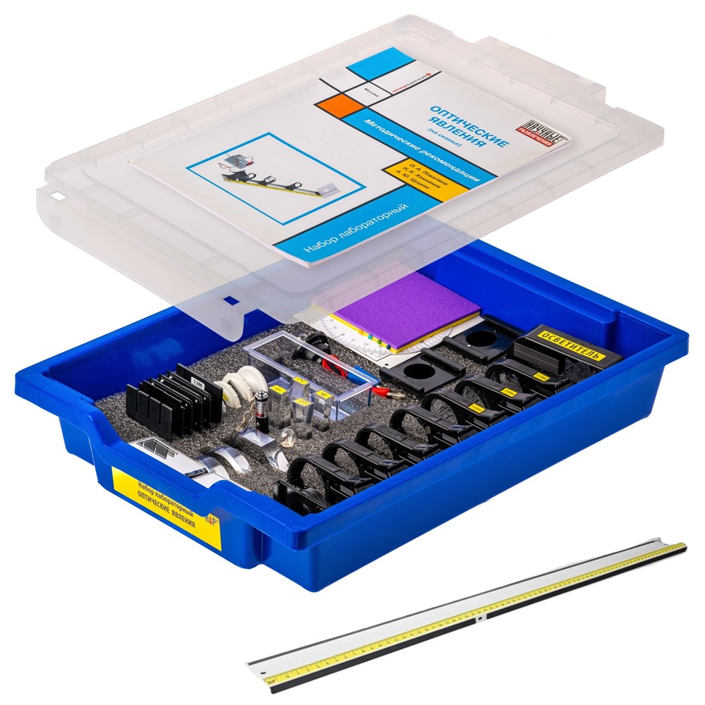 Элементы набора (за исключением оптической скамьи) укомплектованы в пластиковую систему хранения, которая закрывается прозрачной пластиковой крышкой на защелках для обеспечения наблюдения за содержимым. Оборудование внутри системы хранения размещено в ложементе.